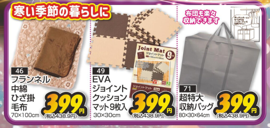 ひざ掛け:2階 ジョイントマット:1階 収納バッグ:2階