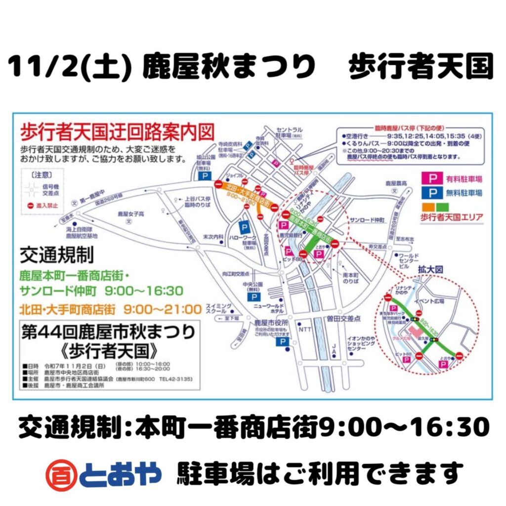 11月2日(日)鹿屋市秋まつり 歩行者天国 交通規制が9:00〜16:30 本町一番商店街は歩行者天国10:00〜16:00 ステージイベントやお子様ゲームコーナー、グルメコーナー、フリマなど とおや店頭ではスーパーボール・アヒルすくい、ドリンク・お菓子など販売します とおや駐車場はご利用できます 2025年11月01日2025年11月01日 とおや 「スーパーボール・アヒルちゃんすくい」とおや店頭で歩行者天国時やってますのできてね お菓子やドリンクも販売します