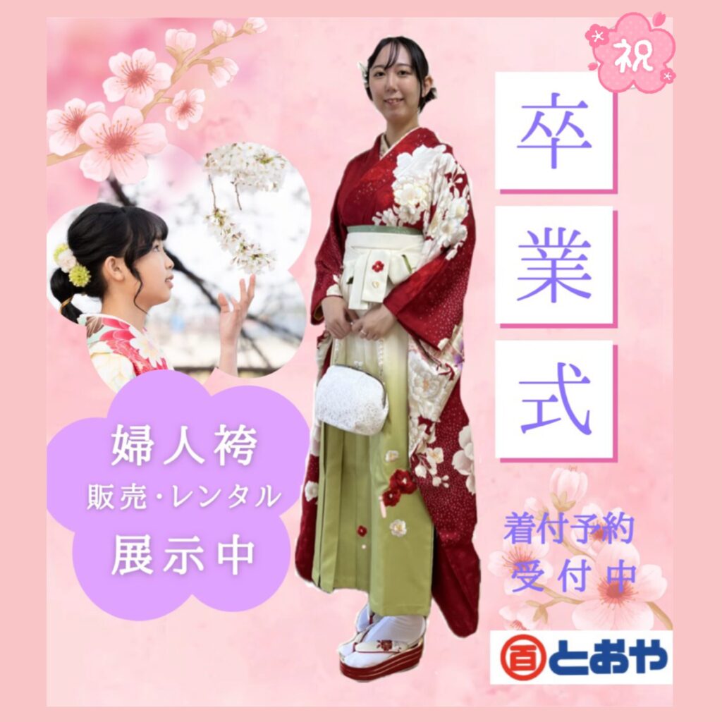 2026年卒業式用婦人袴フェア 2026年02月11日2026年02月11日 とおや 婦人用袴 (無地・ぼかし・刺繍・柄物) 袴単品 販売価格 5,800円+税~45,000円+税 着物・長襦袢・袴3点セット 販売価格 29,800円+税~ はかま帯(リバーシブル・柄・無地)単・袷