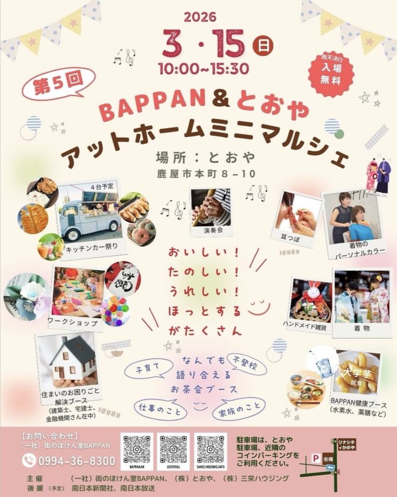 BAPPAN&とおや アットホームミニマルシェが3/15(日)10:00〜15:30 とおやで開催予定です 2026年02月28日2026年02月28日 とおや お問い合わせは、街のほけん室BAPPAN電話0994-36-8300まで