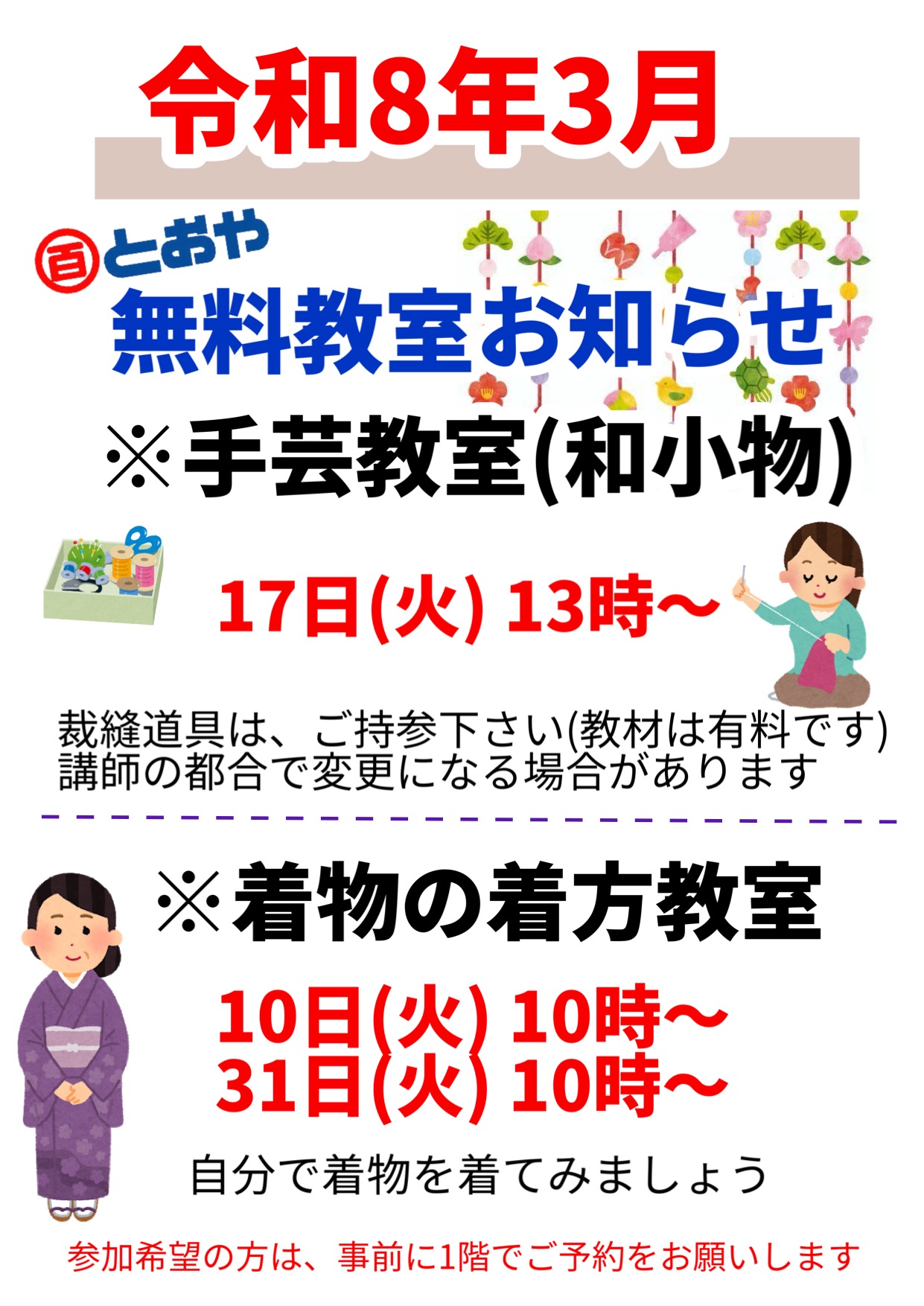 2026年3月無料教室のお知らせ (手芸・着物の着方) 2026年03月02日2026年03月02日 とおや 手芸教室 和雑貨3月17日(火)です裁縫道具はご持参ください材料代は別途かかります材料の準備がありますので事前申し込みをお願いします 着物の着方教室3月10日(火)・31日(火)です自分で着物を着てみましょう♪あなたのレベルに合わせてご指導しますお気軽にお申し込み下さい 事前予約はお電話でも受付いたします電話0994−44−3123営業時間:10:00~18:30定休日 木曜日