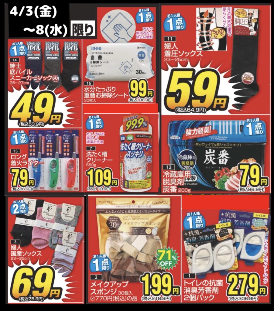 4/3(金)~4/8(水)限定お買得品:1階正面入口