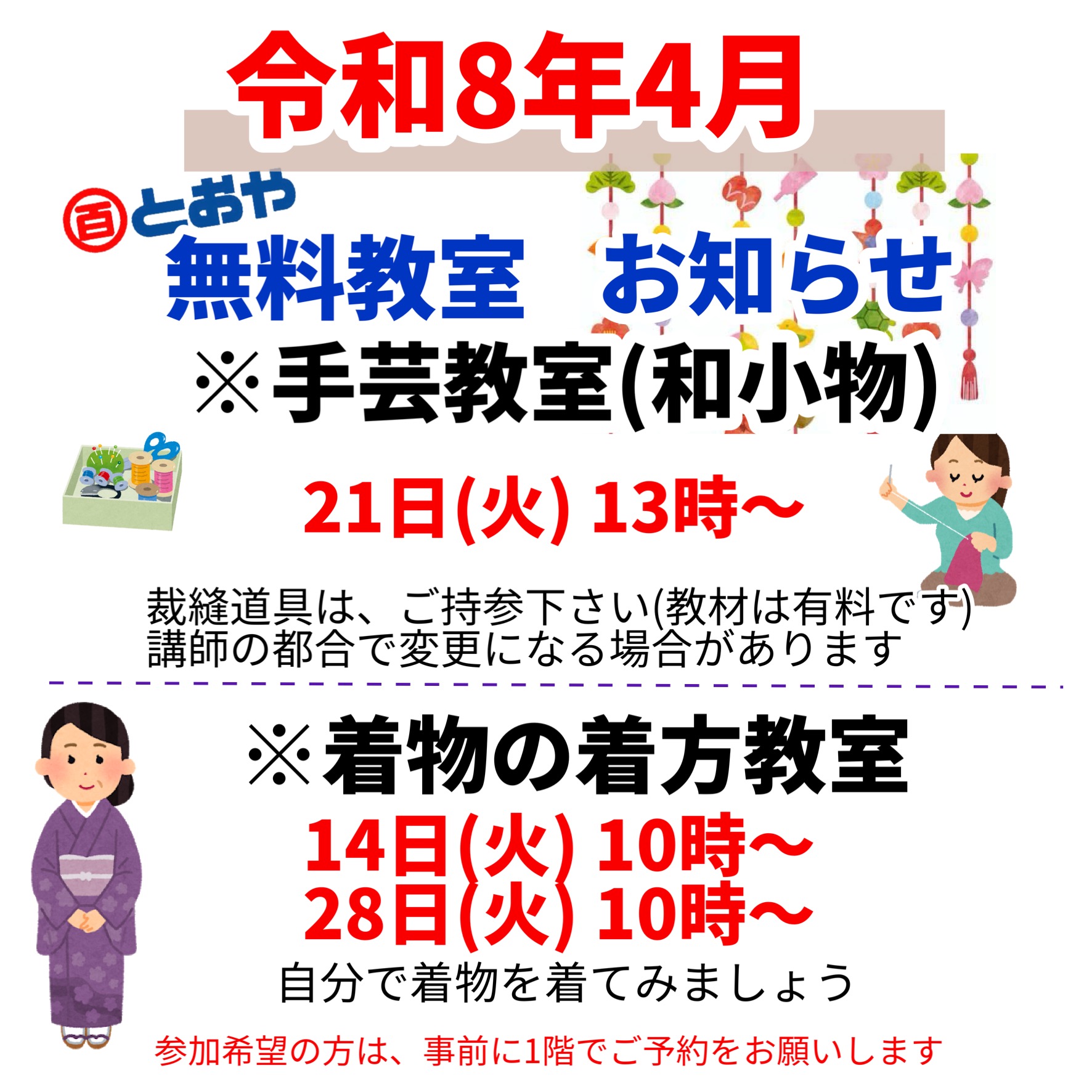 2026年4月無料教室のお知らせ (手芸・着物の着方) 2026年04月09日2026年04月09日 とおや 手芸教室 和雑貨4月21日(火)13:00からです裁縫道具はご持参ください材料代は別途かかります材料の準備がありますので事前申し込みをお願いします 着物の着方教室4月14日(火)・28日(火)です自分で着物を着てみましょう♪あなたのレベルに合わせてご指導しますお気軽にお申し込み下さい 事前予約はお電話でも受付いたします電話0994−44−3123営業時間:10:00~18:30定休日 木曜日